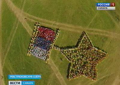 А это флешмоб "Звезда героя". Более пятисот человек в разноцветных футболках выстроились на площадке в форме государственной награды. В центре - почётные гости. Лучи - молодые люди со всех регионов