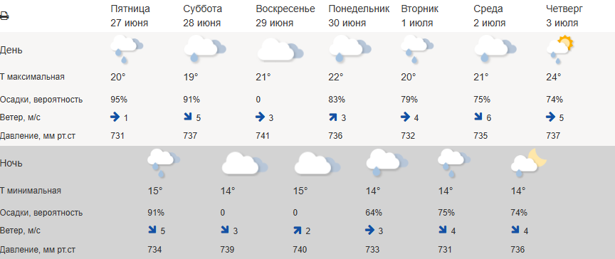 Ночью ожидается облачность с небольшими дождями и температура около 14–15°C. Атмосферное давление останется относительно стабильным, колеблясь от 731 до 741 мм рт. ст., ветер преимущественно слабый.