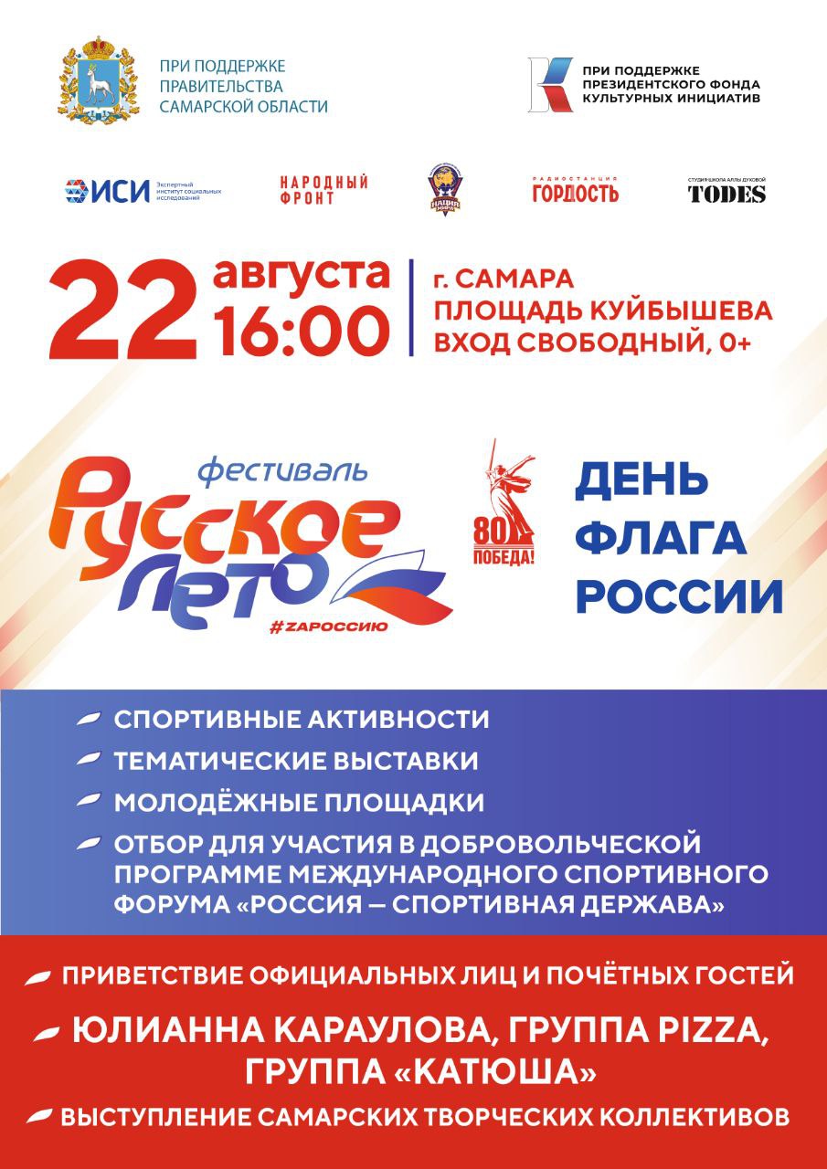 В пятницу, 22 августа, в День Государственного Флага Российской Федерации, Самара примет Фестиваль «Русское лето. ZaРоссию». Жители и гости города соберутся на площади Куйбышева, чтобы почувствовать единство и гордость за победы своего народа. В программе концерт с участием популярной российской певицы Юлианны Карауловой, групп PIZZA и «Катюша». Также участников мероприятия всех возрастов ждут насыщенная спортивная и культурная программа. Дети смогут поделиться желаниями и планами на будущее в интерактивной зоне «Мечтай в России». Проект реализуется при поддержке Президентского фонда культурных инициатив. Подробная программа — на сайте русскоелето.рф.