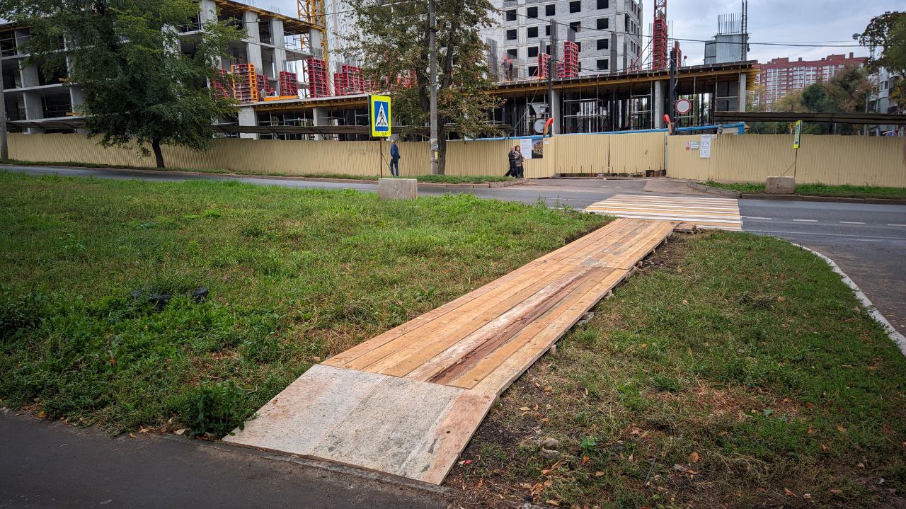 Речь идет об участке на пересечении с ул. 8-й радиальной. Находившийся здесь пешеходный переход перенесли более, чем на 20 м вверх по улице Советской Армии. Теперь он расположен между входом на площадку строящегося здания и газоном на противоположной стороне улице. Здесь на траву положили деревянный настил.