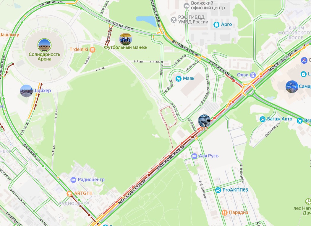 Значительный участок Московского шоссе, начиная от пересечения с Волжским шоссе и почти до улицы Дальней, обозначен темно-бордовым цветом, что свидетельствует о крайне затрудненном движении. Более того, затор наблюдается практически до улицы Ташкенской.