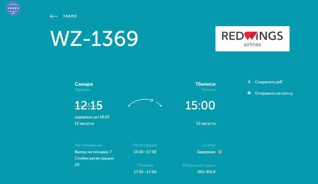 Самолет авиакомпании Red Wings должен был вылететь сегодня в 12:15, однако рейс перенесли. Назначено новое время – 18:10.