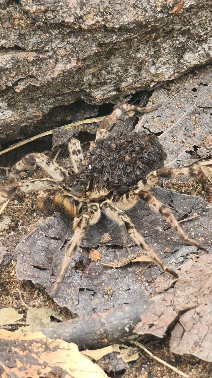 Авторы публикации сообщают, что на выходных 20-21 июля встретили данного паука приблизительно 8-10 см длиной. По изображению больше всего похож на Южнорусского тарантула. Мизгирь, как называют данный вид в народе, из семейства пауков-волков был не один. На спине у самки расположились десятки пауков-малышей.