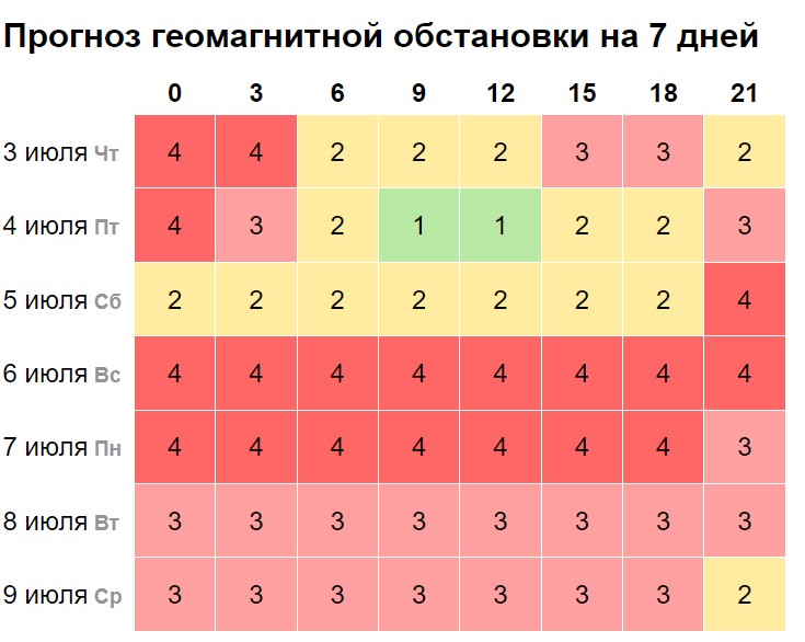 По прогнозу сервиса my-calend, всплески будут происходить в период с 5 по 19 июля. Геомагнитная активность начнет увеличиваться к вечеру субботы, 5 июля. Она достигнет 4 баллов. И такая обстановка продлится 6 и 7 июля.