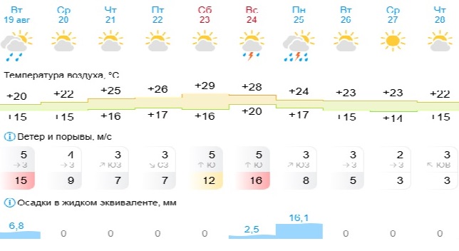 Методичное повышение температуры воздуха начнётся уже в четверг 21 августа. В этот день столбики термометра поднимутся до отметки +25 градусов. В пятницу снова потеплеет, согласно прогнозу синоптиков, до +26.