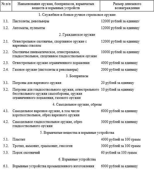 Размеры вознаграждений за сдачу охотничьих ружей, взрывчатых веществ и патронов, согласно прилагаемой к документу таблице, останутся на прежнем уровне.