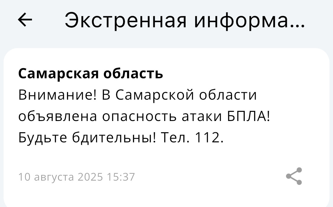 В воскресенье, 10 августа, в 15 часов 37 минут Единая государственная система предупреждения и ликвидации чрезвычайных ситуаций объявила в Самарской области об опасности атаки беспилотных летательных аппаратов.