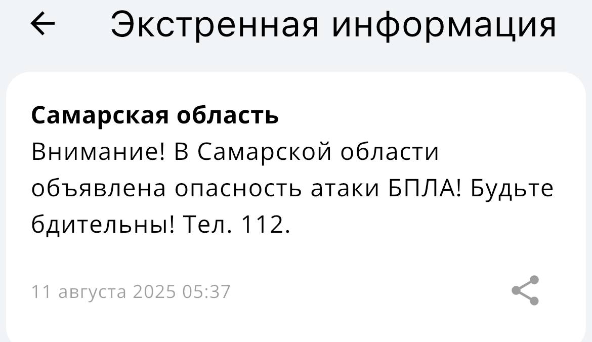 В понедельник, 11 августа, в 5 часов 37 минут, Министерство Российской Федерации по делам гражданской обороны, чрезвычайным ситуациям и ликвидации последствий стихийных бедствий вновь предупредило жителей Самарской области об угрозе атаки дронов. Об этом они сообщили в своем приложении.