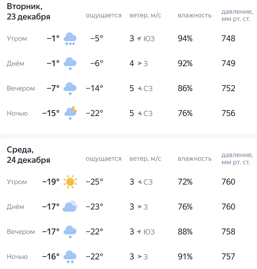 Согласно прогнозу погоды от Яндекс, в понедельник ожидается температура минус 2ºС, однако будет ощущаться как минус 9ºС. Несмотря на относительно небольшую температуру, ветер сделает погоду значительно более холодной и дискомфортной. Во вторник, 23 декабря, днем температура составит минус 1ºС., но ночью она опустится до минус 15ºС. В среду, 24 декабря, днем будет минус 17ºС., но из-за ветра будет казаться, что температура составляет минус 23ºС.