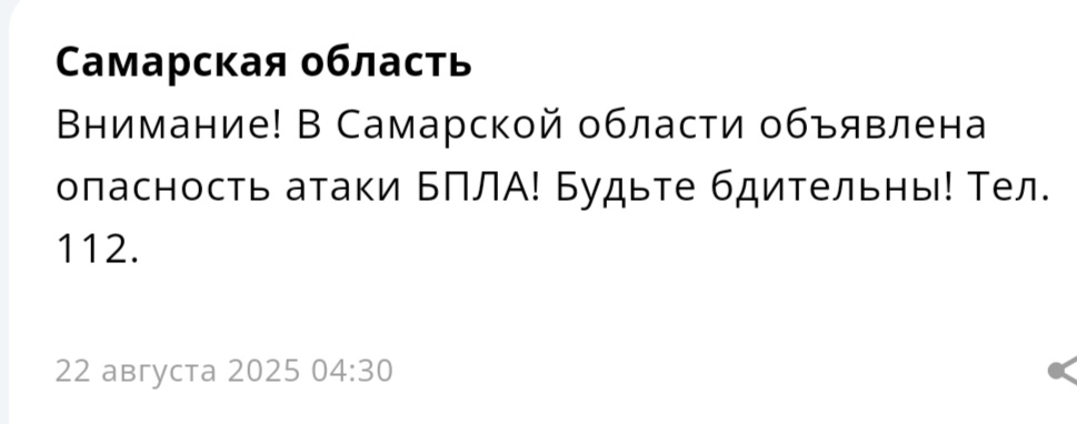 Прошлое подобное оповещение появилось днем ранее, 21 августа, 01 час 52 минуты. В этот раз, как и ранее, власти призывают население быть готовым не только к возможным атакам боевых дронов, но и к временным неудобствам, связанным с мерами защиты. А также просят быть более бдительными.