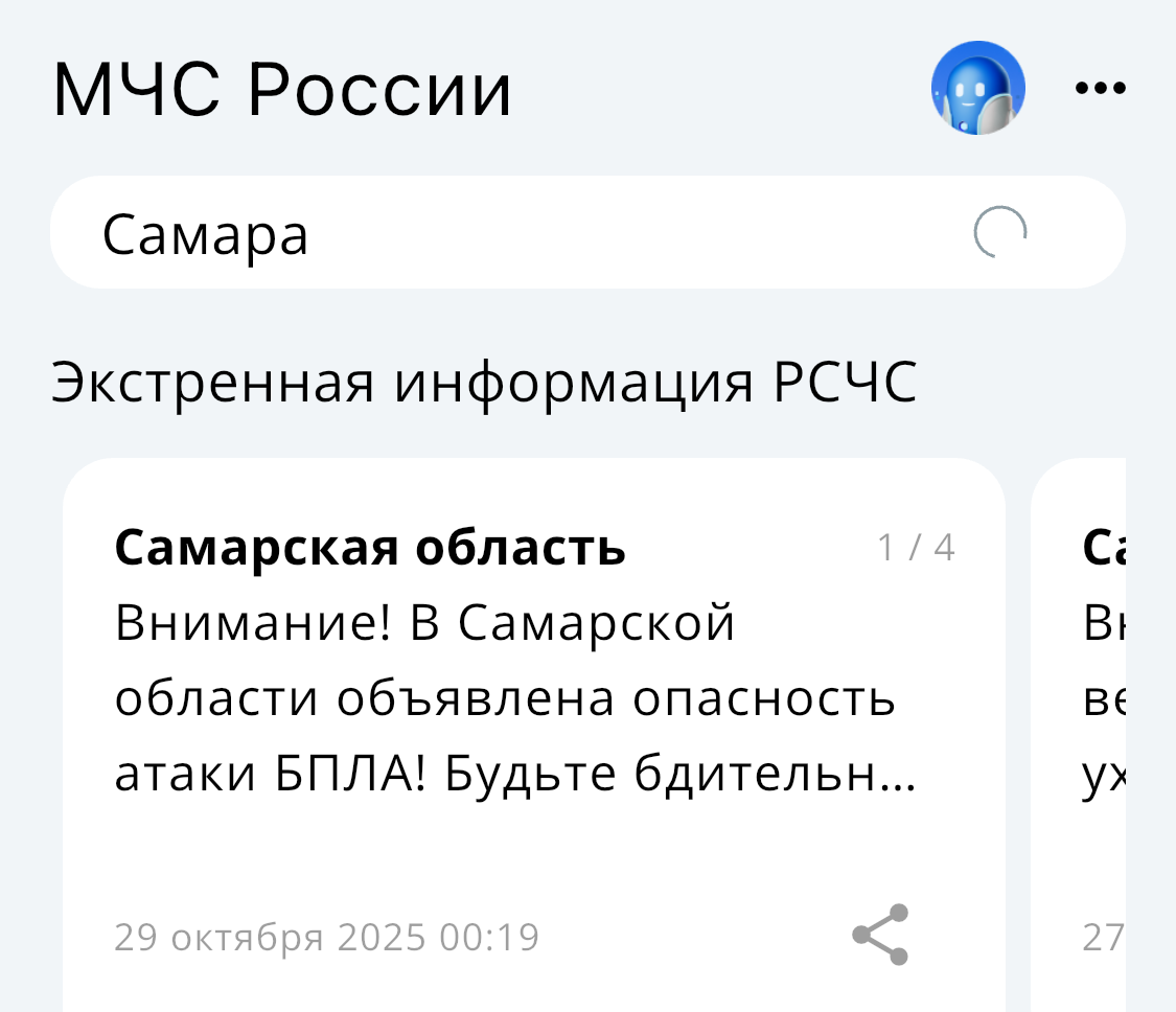Согласно экстренному оповещению, которое получили жители Самарской области в среду, 29 октября 2025 года, в 0 часов 19 минут через официальное приложение МЧС, в регионе была объявлена угроза атаки беспилотных летательных аппаратов. Жителей призвали сохранять бдительность.