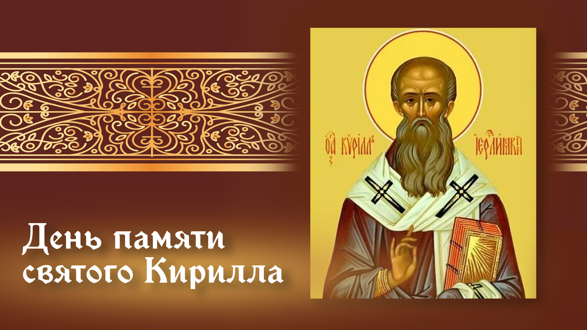 - С днём памяти святителя Кирилла Иерусалимского! Желаю крепкой веры, мудрости и душевного мира. Пусть пример этого великого учителя Церкви вдохновляет вас на добрые дела, а молитва к нему дарует защиту и утешение во всех жизненных обстоятельствах.