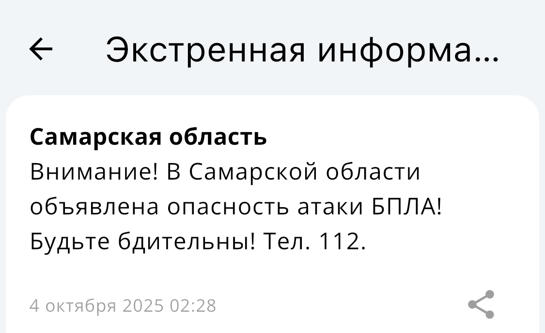 В субботу, 4 октября, в Самарской области была объявлена угроза атаки вражеских БПЛА. Сообщение об этом жителям губернии было разослано специальным приложением МЧС в 2 часа 28 минут. Граждан призвали сохранять бдительность.