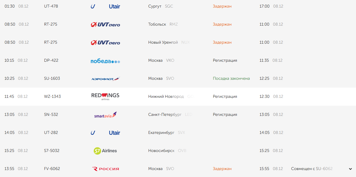 На данный момент согласно онлайн-табло, задержаны как минимум четыре вылета: в Сургут, Тобольск, Новый Уренгой и Москву. Задержки превышают два часа, что существенно влияет на расписание и планы путешественников. Пассажирам рекомендуют уточнять актуальную информацию у авиакомпаний и на сайте аэропорта.