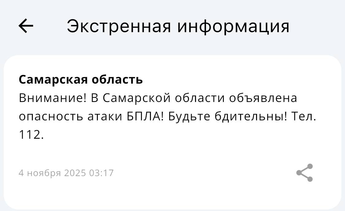 4 ноября в Самарской области началось с экстренного оповещения от МЧС об угрозе атаки БПЛА. Официальное сообщение в приложении ведомства пришло в 3 часа 17 минут.