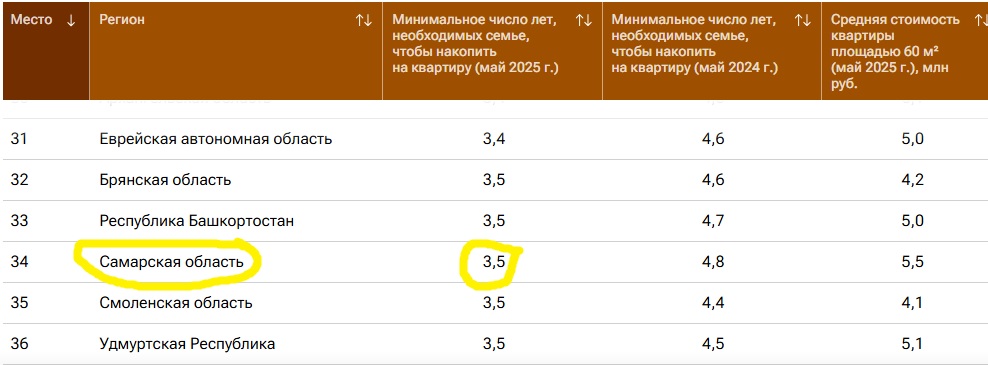 Эксперты составили рейтинг регионов по доступности жилья. Для этого они сделали расчеты, сколько же денег и лет понадобится на покупку квартиры общей площадью 60 квадратных метров. В качестве данных взяли средние доходы, опубликованные Росстатом, минимальные прожиточные расходы на каждого члена семьи и банковские проценты, которые будут увеличивать накопления. В итоге Самарская область попала на 34 место из 89 по стране.