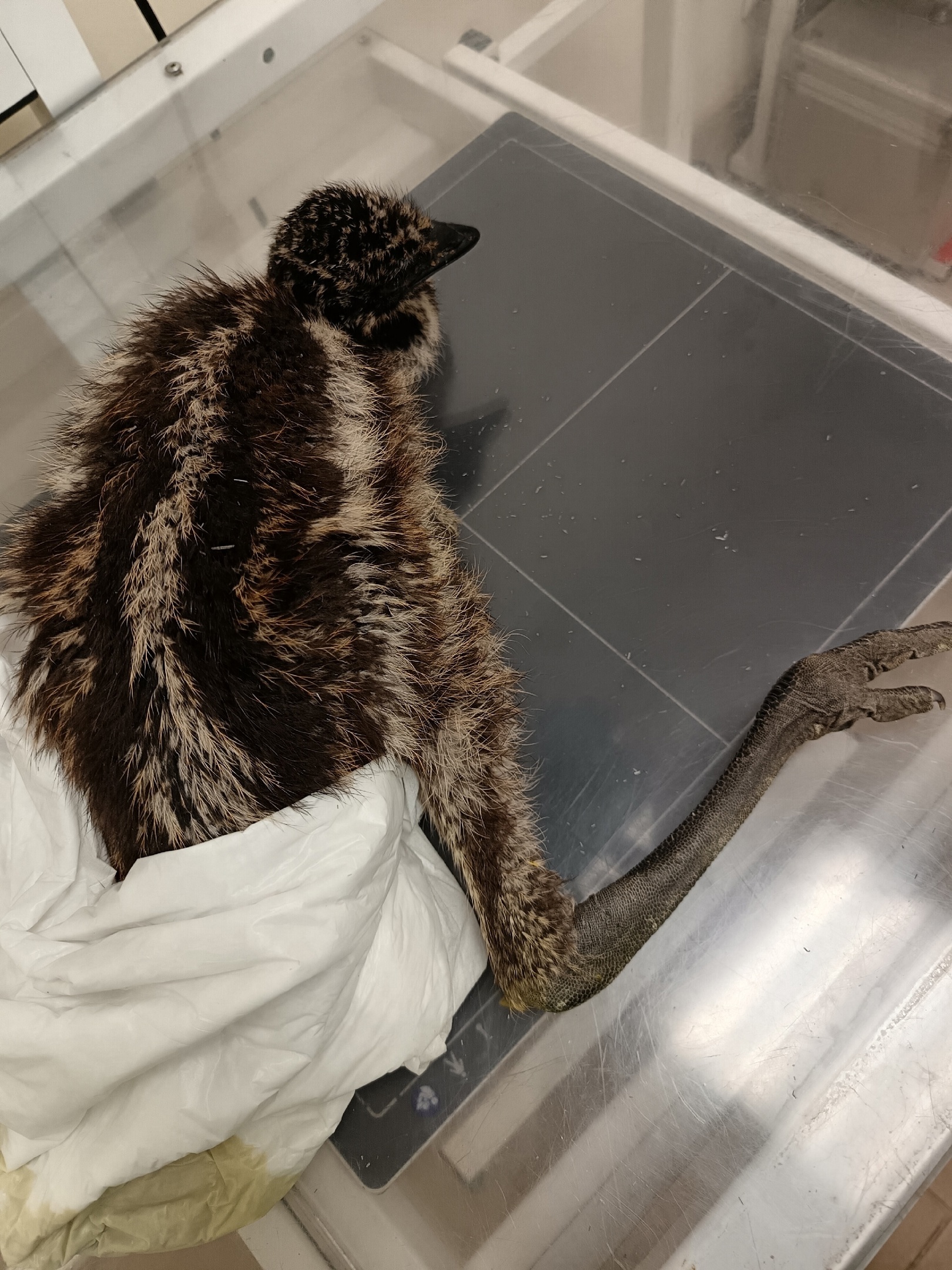 К тому же, как и у многих птиц в условиях плохого питания, у эму развились проблемы с суставами — лапы вывернуты вбок, стоять самостоятельно он не может. Сегодня ветеринары установили лонгету для выравнивания конечности, а также назначили усиленное питание с витаминами и кальцием.