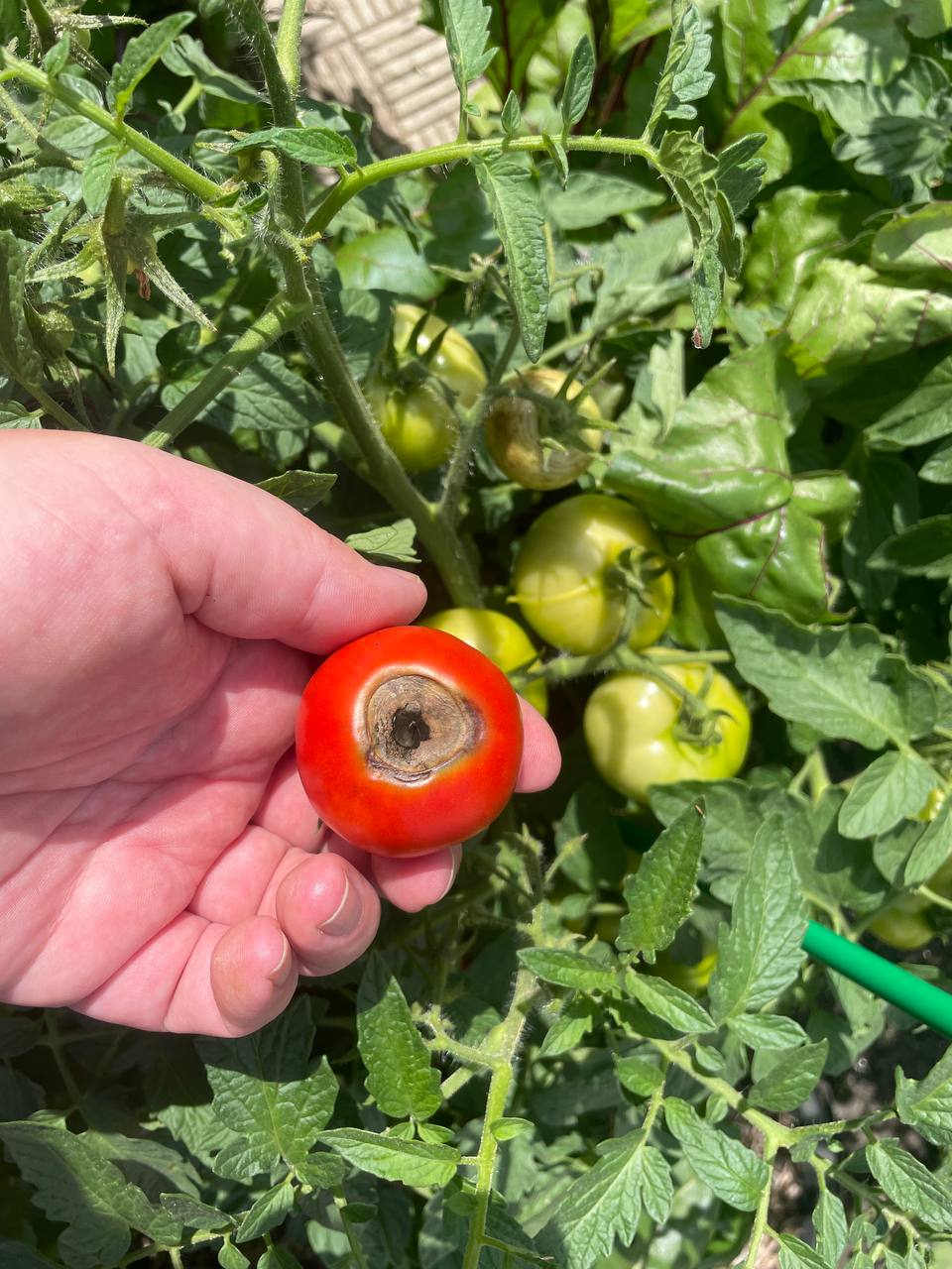 По их словам, сначала на плодах появляются тёмные, слегка вдавленные пятна, чаще у плодоножки или на боку. Затем поражённые участки разрастаются, становятся чёрными и водянистыми. В итоге помидор сгнивает полностью, даже если остальная часть куста выглядит здоровой.
