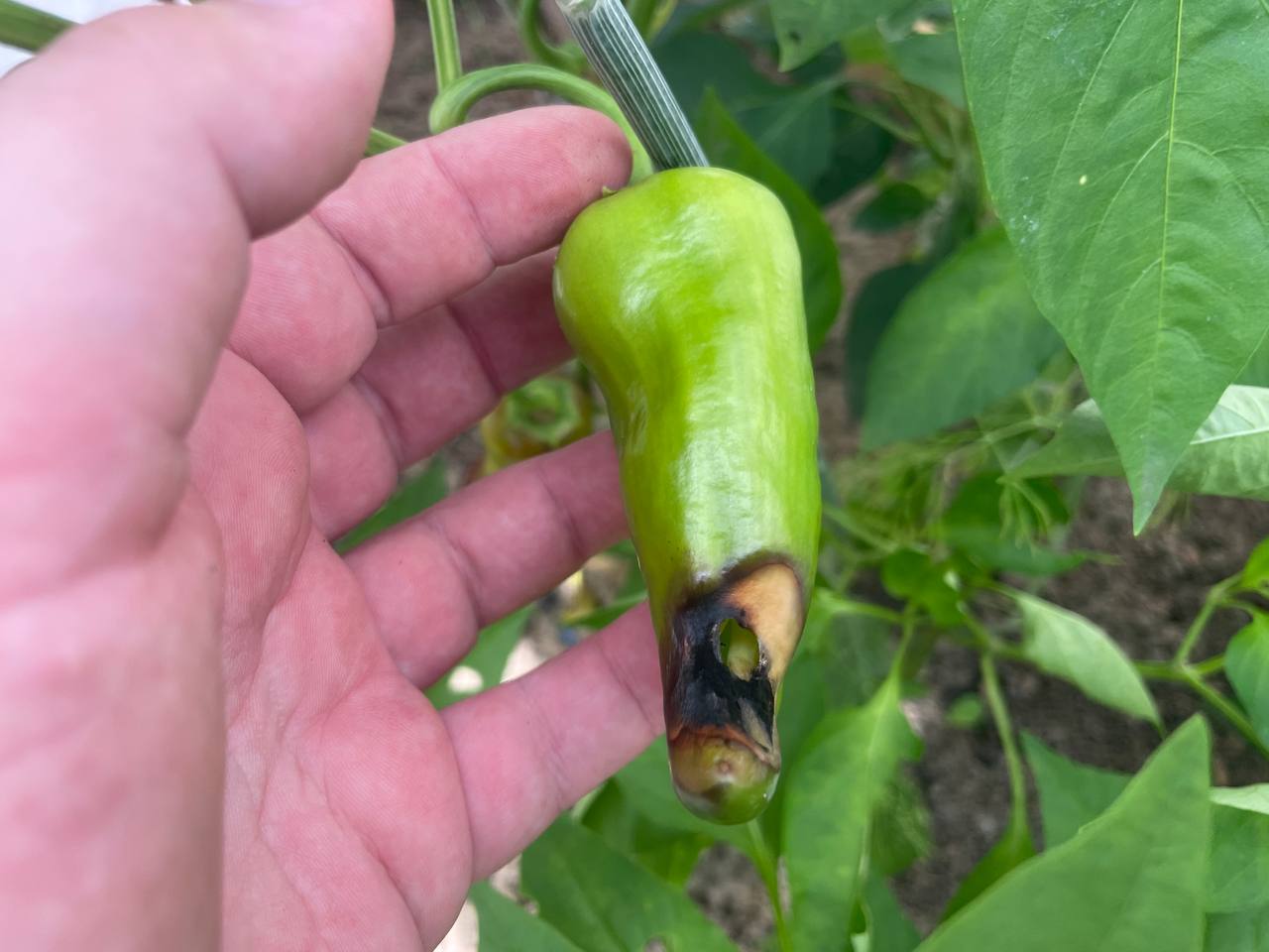 Вершинная гниль (Чёрные плоские пятна на верхушке плода. Появляется из-за дефицита кальция и неравномерного полива. Не передается от растения к растению).