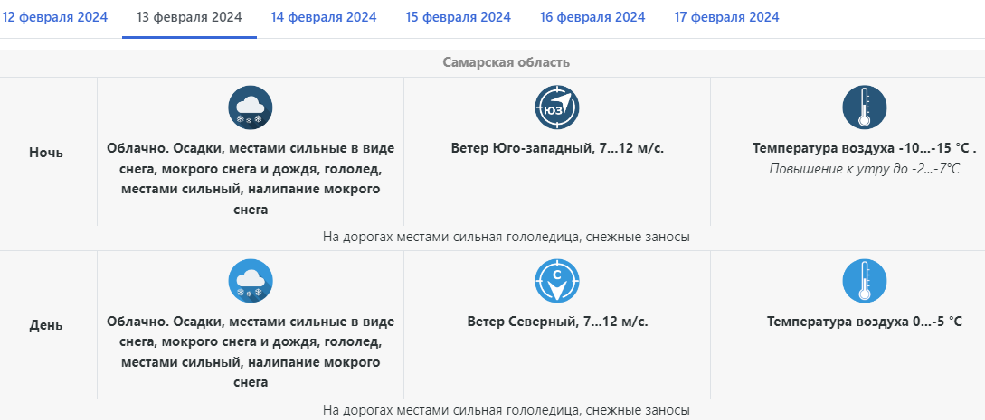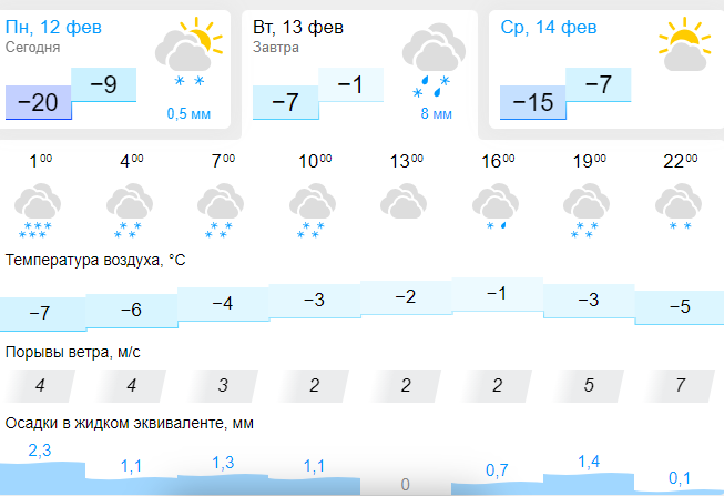 Информация на сайте Гисметео немного отличается от предыдущих источников. Синоптики утверждают, что максимальная температура 13 февраля составит -1 градус. Метеорологи отмечают, что потеплеет во второй половине дня (примерно в 16:00). В это же время пойдет дождь вперемешку со снегом. Прекратятся осадки ближе к 19:00.