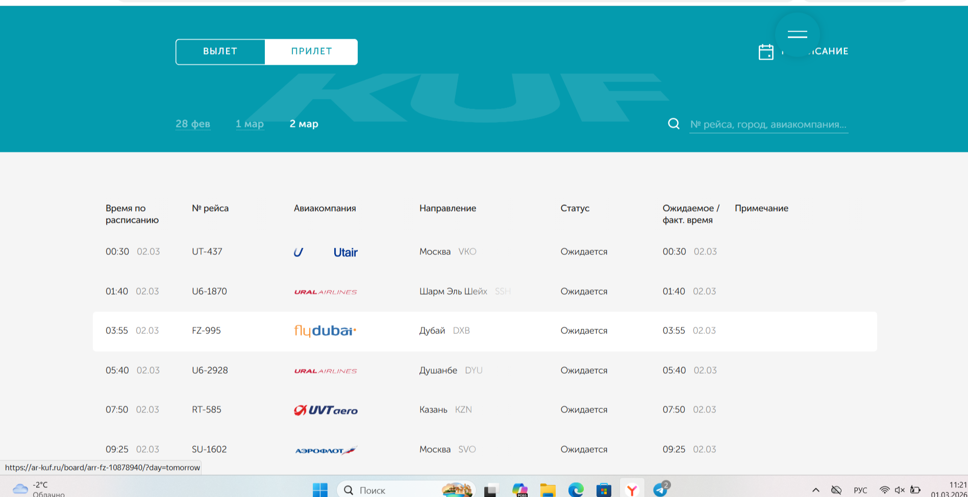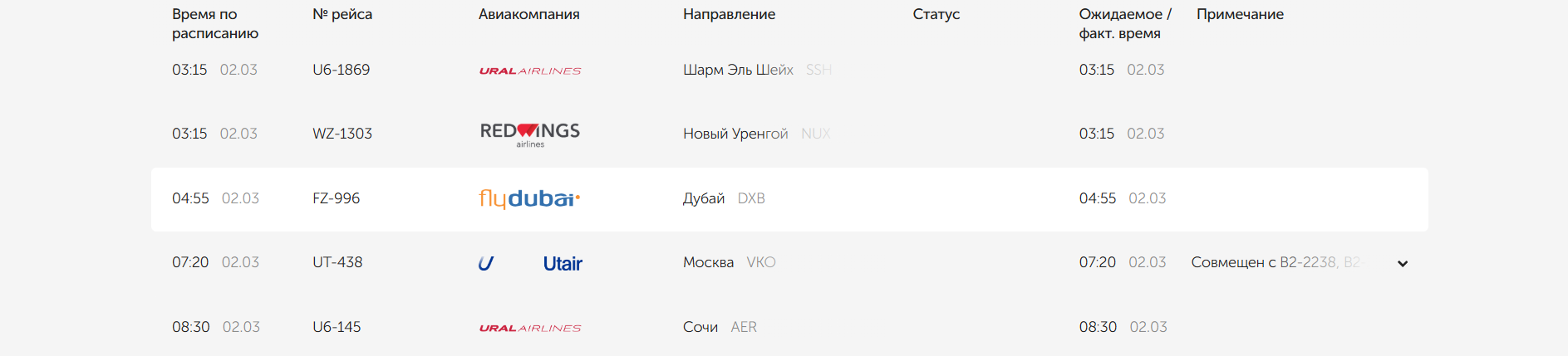 Также на 2 марта назначен вылет в Дубай из Самары в 04.55 (по местному времени). Дополнительных статусов на данный рейс онлайн-табло не указывает, значит, пока отмены нет.
