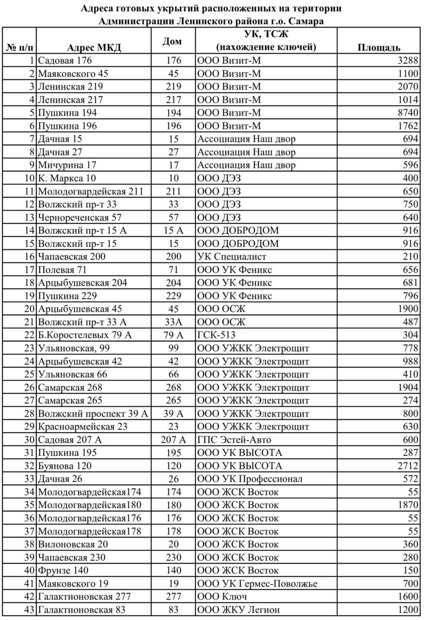 Публикуем полный список адресов укрытий Ленинского района Самары