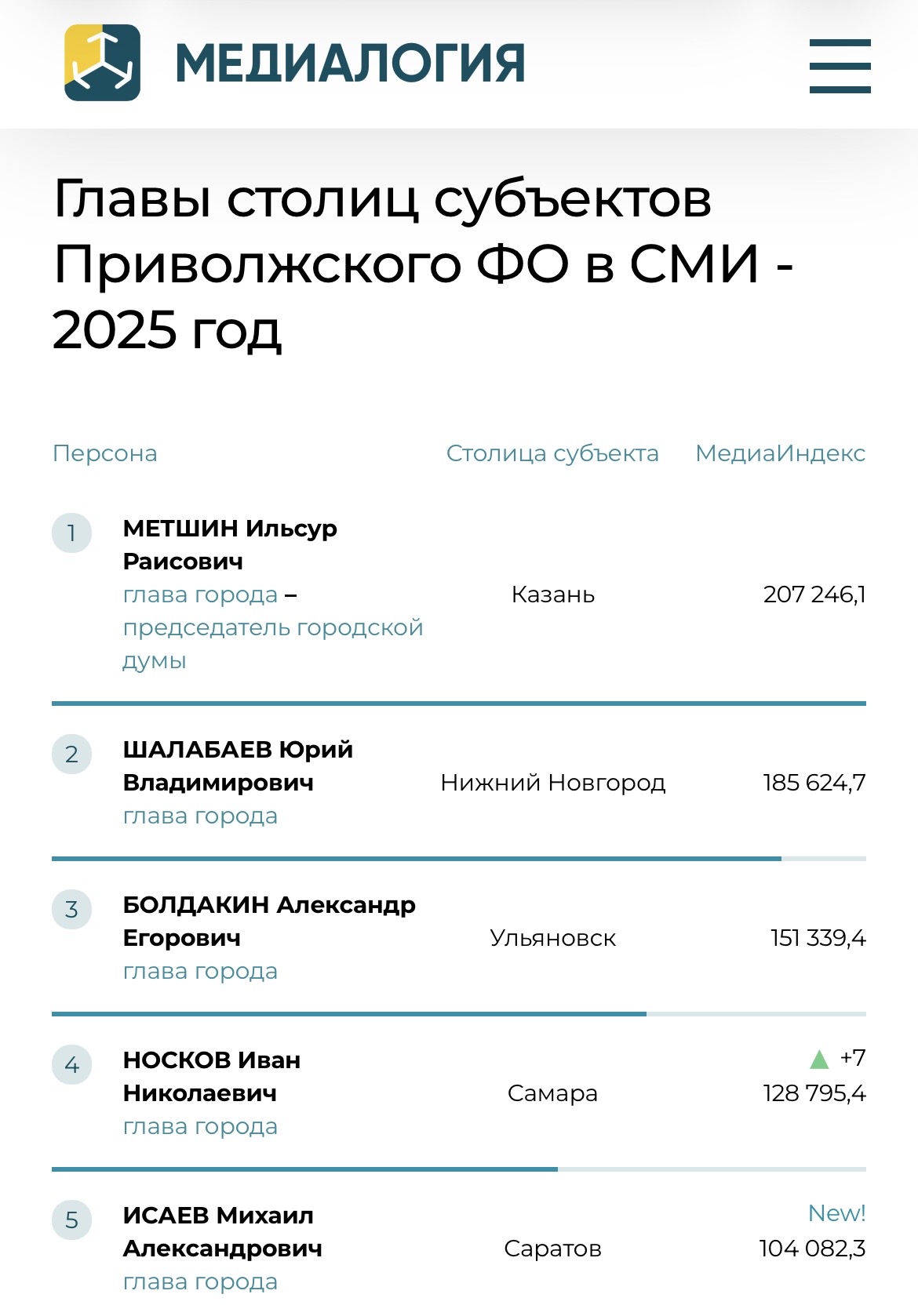 Первую строчку рейтинга самых цитируемых мэров ПФО занимает глава Казани – председатель городской думы Ильсур Метшин (207 246 пунктов), а на последней 28-ой строчке – новый участник рейтинга Владимир Островский, он занимает должность председателя городской думы Саратова (29 пунктов).