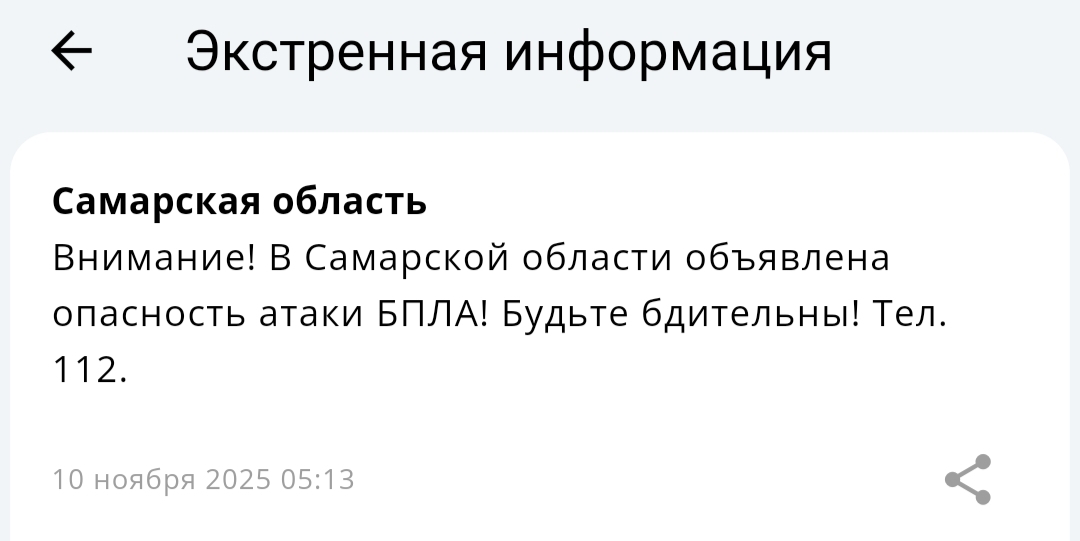 10 ноября в Самарской области в 5 часов 13 минут была объявлена опасность атаки вражеских беспилотников. Об этом жителям региона сообщили в специальном приложении МЧС России. Кроме того, гражданам настоятельно рекомендовали сохранять бдительность.