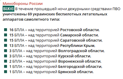 Всего по России за это время было уничтожено 69 украинских летательных аппаратов самолетного типа. Об этом сообщили в Минобороны страны.