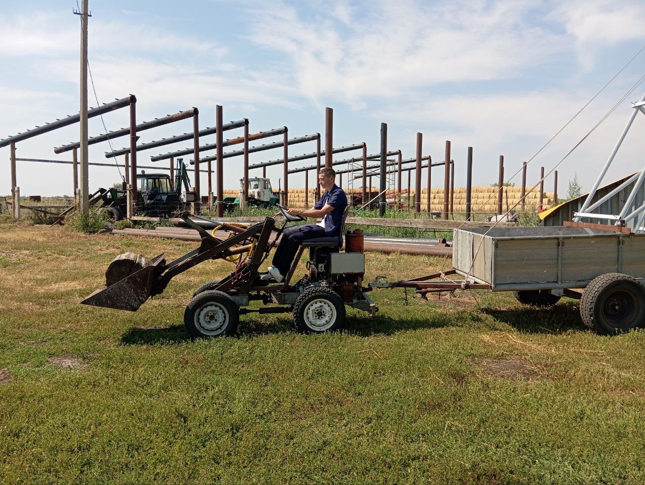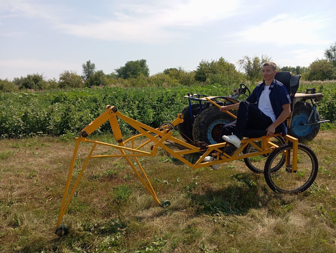 Денис вырос на ферме родителей, и большинство сделанных им технических средств берут на себя тяжелую работу. Полноприводный мини-помогатор зерно в ангаре подвинет и тяжелый груз перевезет. А вместе с лестницей, кстати, тоже собранной самим инженером, погрузчик превращается в первого помощника при строительстве.