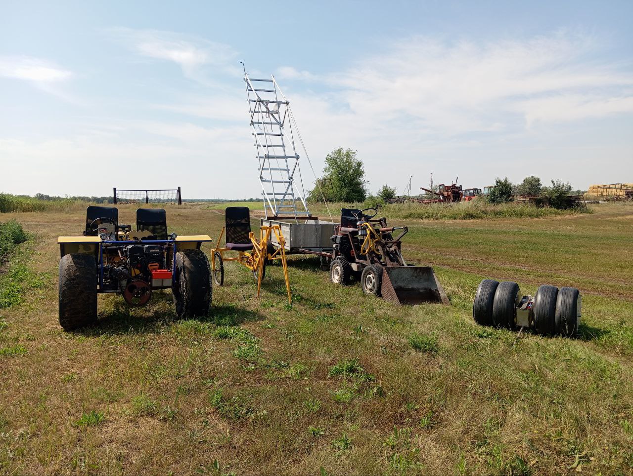 Денис вырос на ферме родителей, и большинство сделанных им технических средств берут на себя тяжелую работу. Полноприводный мини-помогатор зерно в ангаре подвинет и тяжелый груз перевезет. А вместе с лестницей, кстати, тоже собранной самим инженером, погрузчик превращается в первого помощника при строительстве.