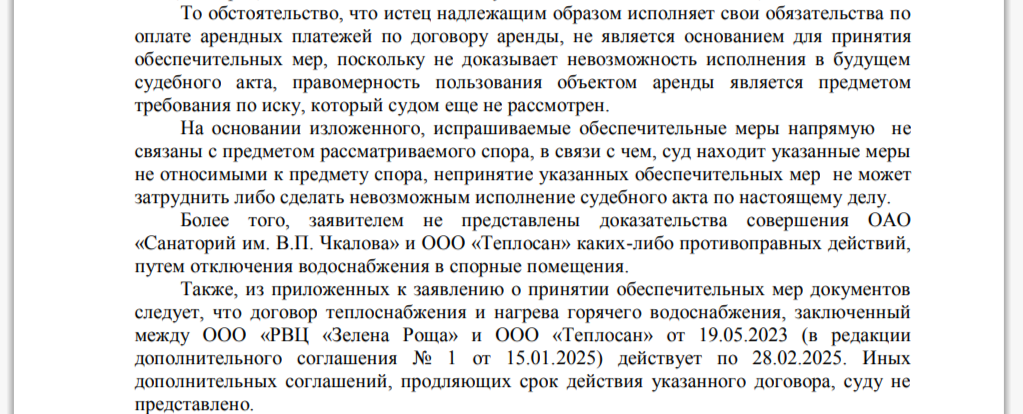 В отказе в обеспечении иска также изложено, что договор теплоснабжения пансионата действует до 28.02.2025, и не было представлено дополнительных соглашений о его продлении. Суд не нашел связи между испрашиваемыми мерами и предметом спора, поэтому заявление было отклонено.