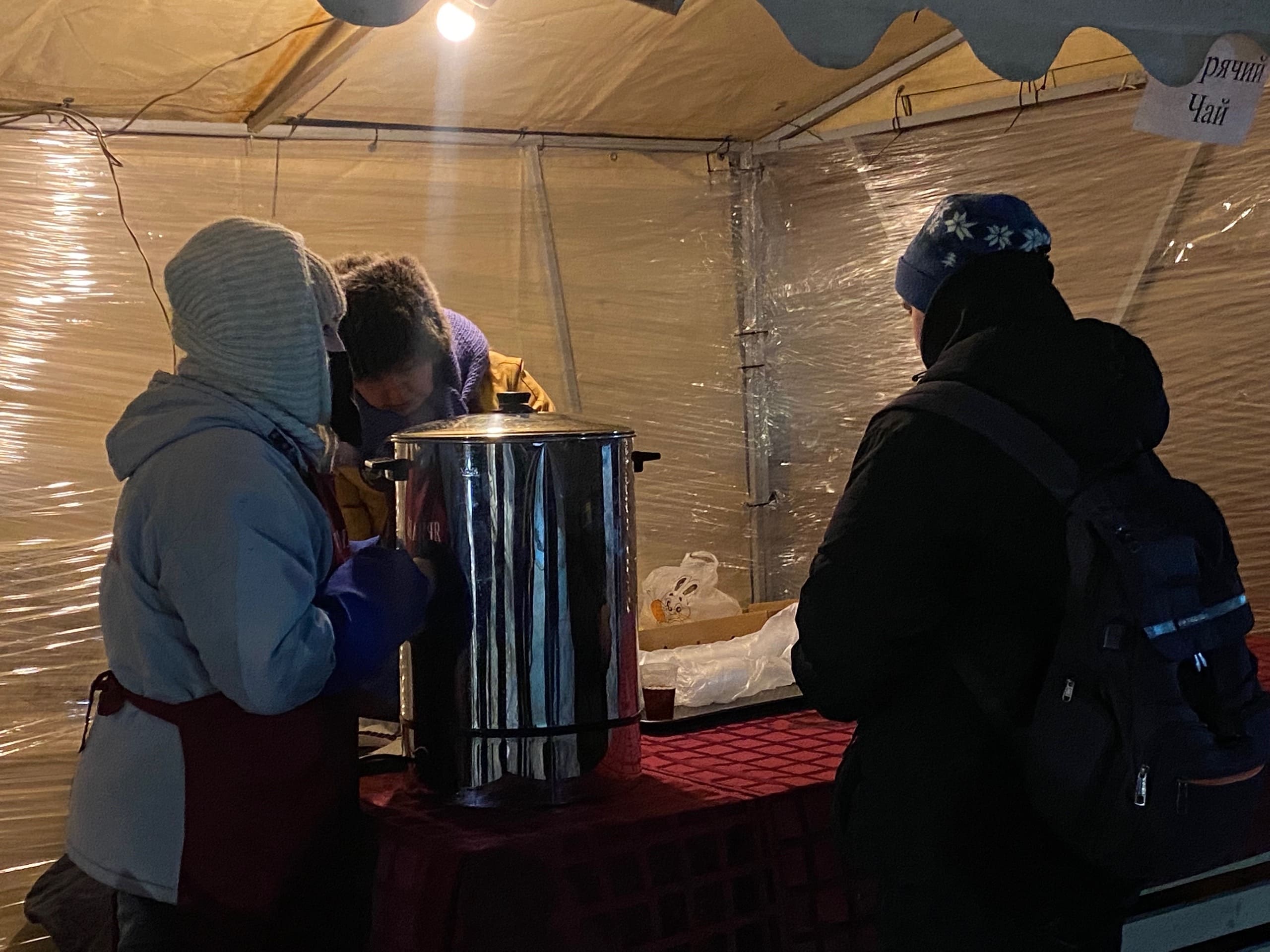 Место для крещенских купаний на Волге тщательно подготовили: купель оборудовали деревянным настилом для безопасного подхода, спуск в воду выполнили в виде моста на сваях, рядом установили тёплые палатки для переодевания и организовали пункт обогрева с бесплатным горячим чаем и бутербродами.