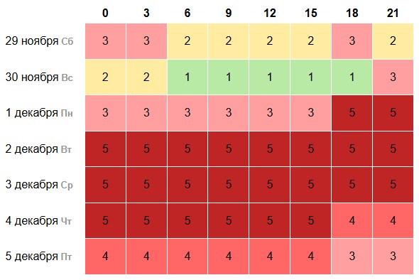 Днем в воскресенье, 30 ноября, магнитное поле будет спокойным, но уже к вечеру ситуация начнет ухудшаться. Начавшись с 3 баллов, магнитные колебания достигнут 5 баллов к вечеру понедельника, 1 декабря. Такая обстановка будет сохраняться вплоть до 15 часов четверга, 4 декабря.