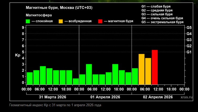 Учёные из Лаборатории солнечной астрономии сообщили, что 2 апреля на планете началась магнитная буря средней силы. Причиной стал поток быстрого солнечного ветра от необычно большой дыры на Солнце.