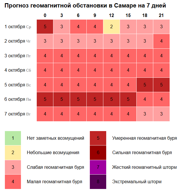 В начале октября Самару ждет испытание на прочность — серия магнитных бурь, пик которой придется на среду, 1 октября. Согласно данным метеорологических служб, ожидается магнитная буря силой 5 баллов, что классифицируется как умеренное, но ощутимое возмущение.