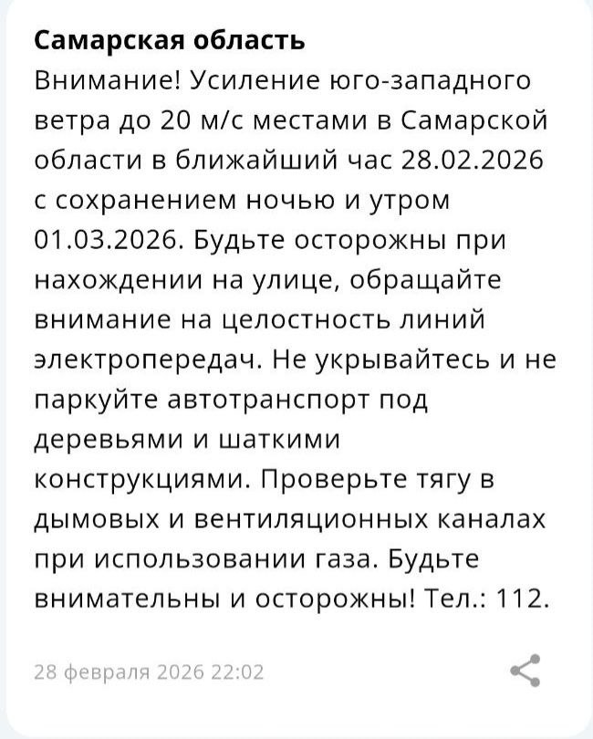 По информации ФГБУ «Приволжское УГМС», в ближайший час, с сохранением ночью и утром 1 марта 2026 года местами в Самарской области ожидается усиление юго-западного ветра, порывы 15–20 м/с.