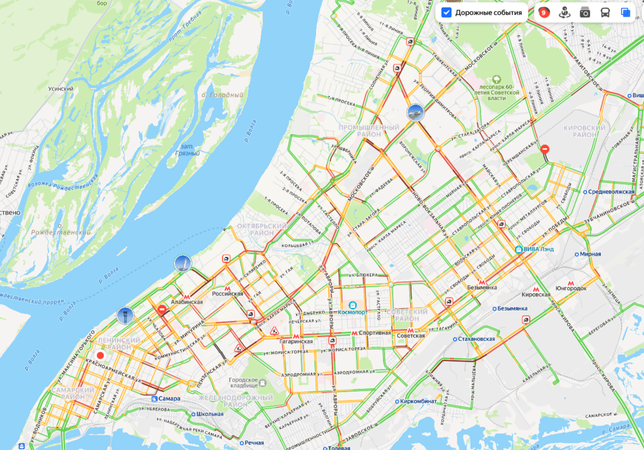 Красным цветом уже традиционно отмечены улицы Ново-Садовая, Тухачевского, Московское шоссе, Победы, Мичурина, Красноармейская и проспект Ленина. Тяжелая обстановка и на выезде из города — многие самарцы стремятся раньше покинуть город перед новогодними праздниками.