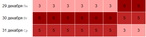 После краткого спада до 3 баллов с вечера 27 декабря до 29 декабря, магнитная обстановка вновь ухудшится в конце недели. Наиболее сильный удар ожидается с вечера 29 декабря и 30 декабря — прогнозируется буря силой в 6 баллов.
