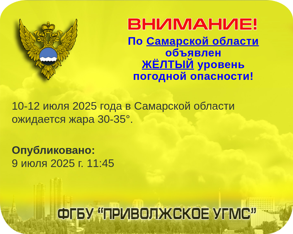 От ФГБУ «Приволжское УГМС» получена консультация: «Объявлен желтый уровень опасности. 10-12 июля 2025 в Самарской области ожидается жара +30, +35 С».