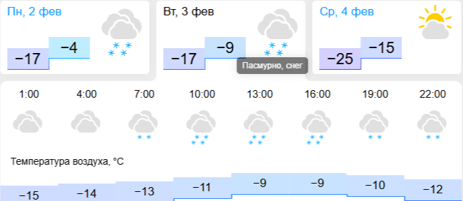 Синоптики портала "Гисметео" дают на этот день другие прогнозы: -9°C днем и -17°C ночью. Кстати, в остальные дни, по их данным, будет еще холоднее: в среду, 4 февраля до -25°C.