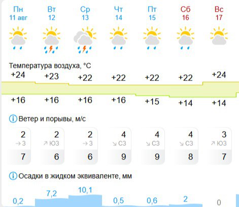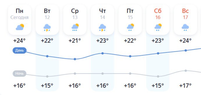 Если понедельник, 11 августа, сохранит в себе погоду июля с летними +25° и отсутствием осадков, то на следующий день ситуация изменится. Синоптики "Яндекс погоды" ожидают грозы и резкое понижение температуры до +21° днем. По данным сервиса такие показатели сохранятся на всю рабочую неделю и грядущий уикенд. Однако в выходные будет потеплее: до +23-24° днем.