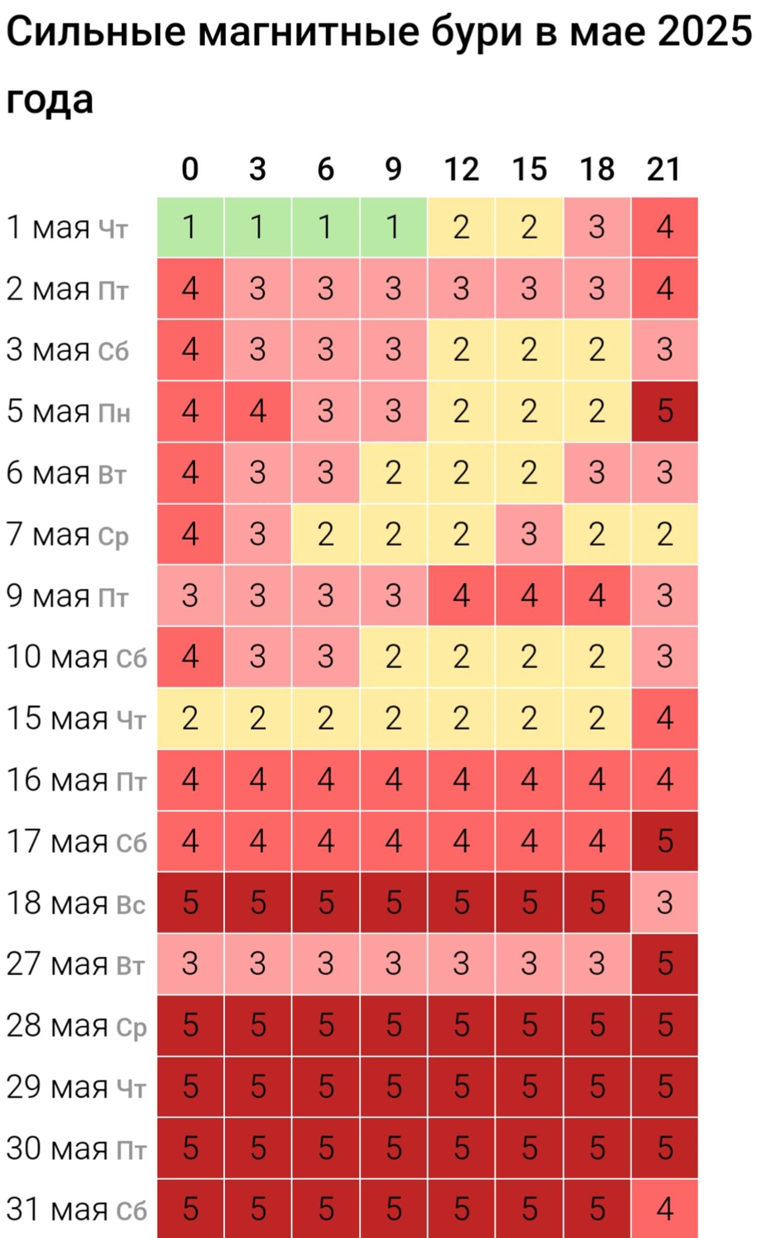 С 19 по 21 мая станет полегче, уровень геомагнитных колебаний снизится др 3 баллов. Судя по прогнозам, рост геомагнитной активности ожидается и в самом конце месяца (с вечера вторника, 27 мая).