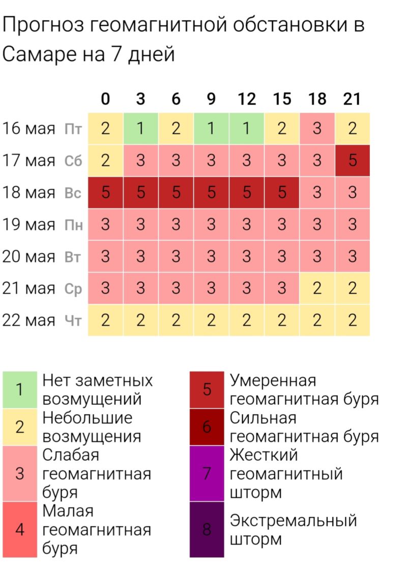 В первой половине дня в субботу, 17 мая, ожидается относительно спокойная обстановка. Показатель геомагнитной активности будет держаться в пределах 3 баллов, что специалистами оценивается как слабая магнитная. А вот уже вечером субботнего дня ситуация резко изменится. Мощность атаки достигнет опасных 5 баллов. Полегче станет лишь в воскресенье, 18 мая, вечером. Уровень геомагнитных колебаний снизится до 3 баллов и продержится несколько дней.
