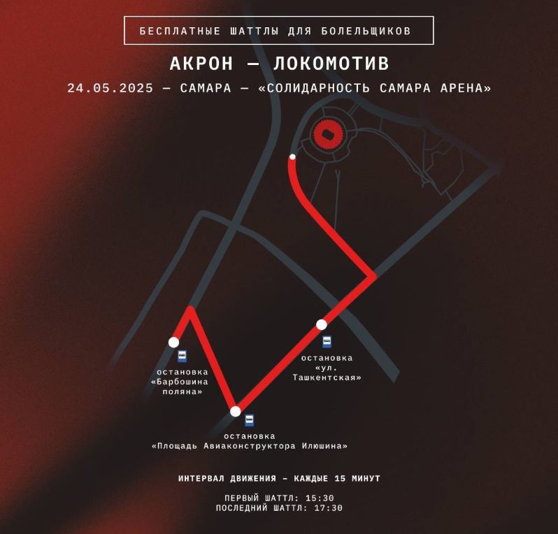 Бесплатные шаттлы будут курсировать по маршруту: остановка "Барбошина поляна" - остановка "Площадь авиаконструктора Ильюшина" - остановка " ул. Ташкентская" - стадион "Солидарность Самара Арена".