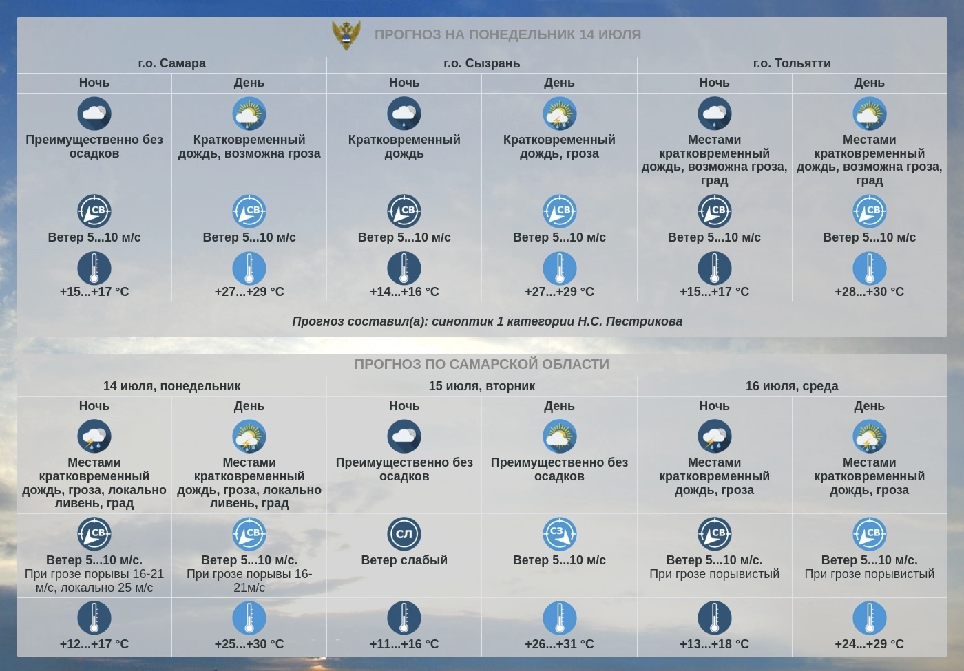 Неделя с 14 июля принесёт жителям Самарской области ночное похолодание до +12…+17°С