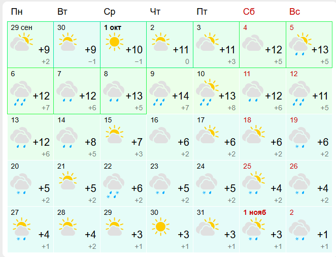 Сервис Яндекс.Погода обещает похожий прогноз на месяц - максимальная температура воздуха +14°C в начале октября. А вот с 21 числа снега не наблюдается - вероятны только дожди с температурой воздуха от +4°C до +7°C днем. По ощущениям будет холоднее, до -2°C.