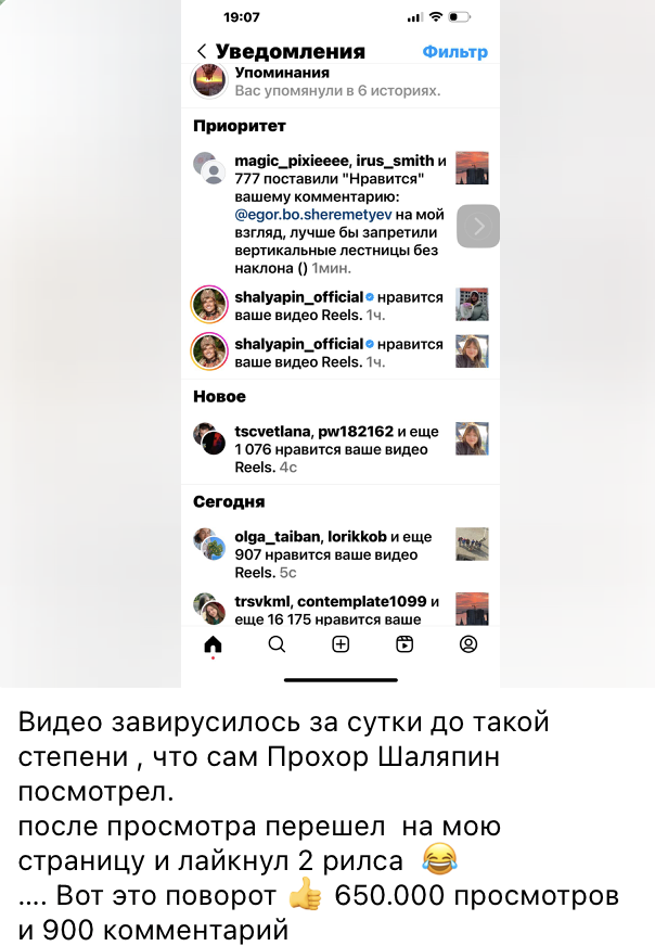 Согласно комментариям автора, опубликованное ею видео набрало внушительные 650 тысяч просмотров в социальной сети. Скриншоты подтверждают, что официальным аккаунтом популярного исполнителя Прохора Шаляпина был поставлен лайк данному посту.