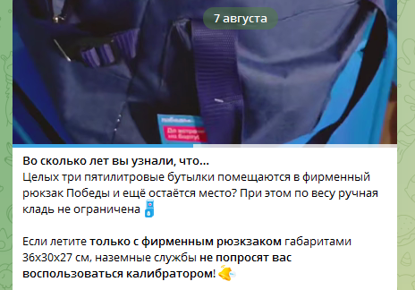 Ручная кладь и раньше была не ограничена по весу, что следует из публикации от 7 августа в тг-канале авиакомпании: об этом «Победа» не раз заявляла в своих соцсетях, выделяя данный факт как преимущество перевозчика на рынке.