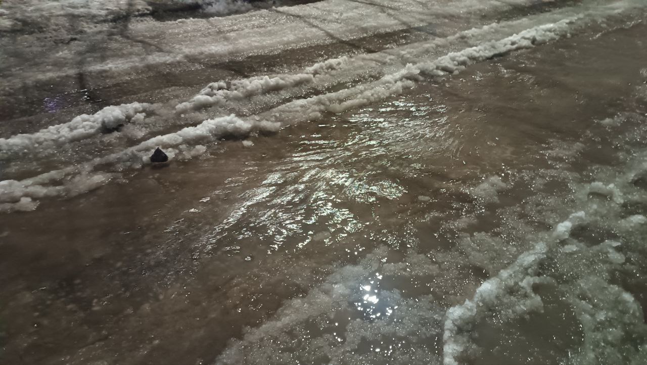 Автомобили вынуждены буквально «плыть» по воде, глубина которой, по словам очевидцев, достигает щиколотки, а затем преодолевать участки гололёда. Водители двигаются цепочкой на минимальной скорости, опасаясь не только зацепить скрытые под водой коммуникации, но и потерять управление на льду.